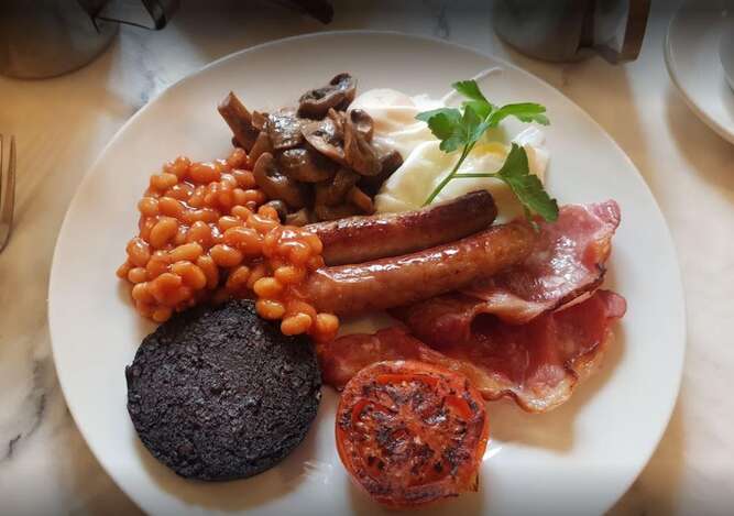 Then tuck in to a hearty cooked breakfast. Made to order, you can choose from eggs, bacon, local sausage, black pudding, tomato, baked beans and mushrooms.